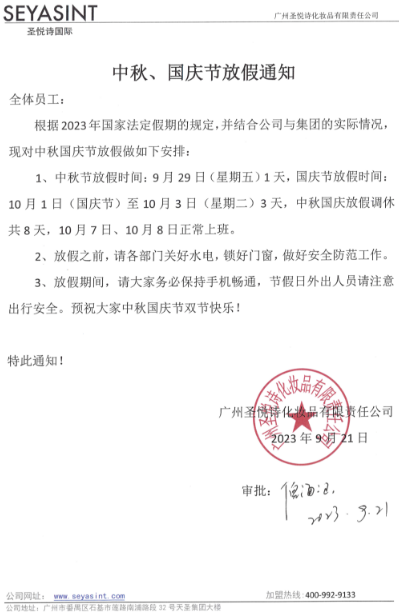 圣悅詩國際美妝中秋國慶放假通知