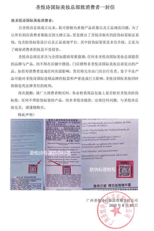 圣悅詩國際美妝總部致消費者一封信