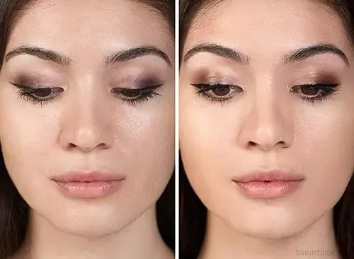 妝容明顯比左邊自然,遮瑕和均勻膚色效果都很好,沒有很濃的妝感,粉底液質(zhì)地輕薄,粉底刷細(xì)密的刷毛起到了幫助臉部均勻上妝的輔助作用。