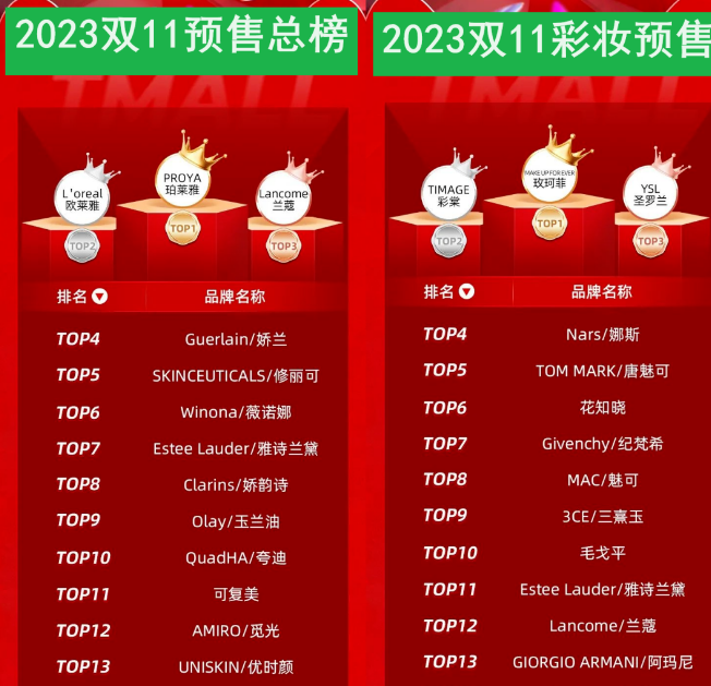 10月24日-10月31日預(yù)售期間,天貓美妝類目GMV約180.47億元!在彩妝榜單中,外資品牌占據(jù)14個席位,